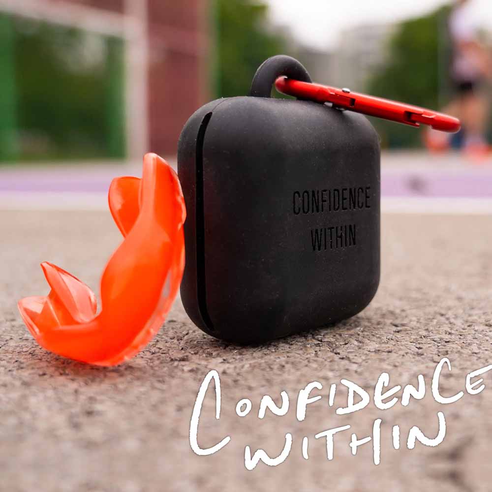 The SafeJawz mantra "Confidence within" is printed on the lid for extra motivation. Suitable for most brands of mouthguards.