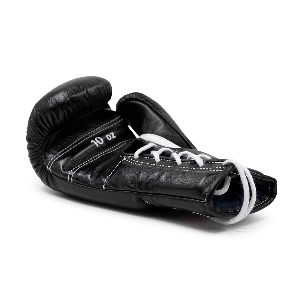 The Winning MS300 Black boxing gloves (lace-up) are made from the finest quality leather. Winning boxing gloves undergo rigorous quality control throughout the entire development process. Only the very best gloves pass the stringent tests. The sewn-on thumb prevents eye injuries and also ensures that the thumb itself is not injured.