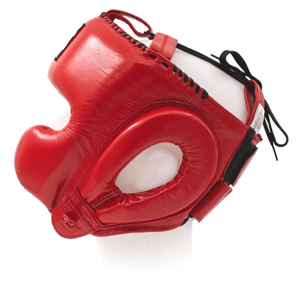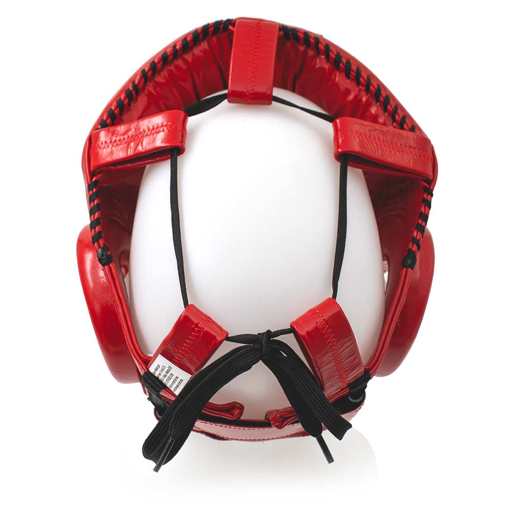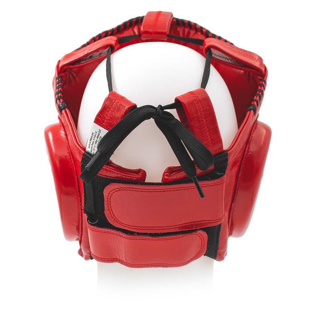 This is the ultimate universal head protection, specifically designed for boxing and other martial arts. It's made of the highest quality leather and features latex foam padding. The back closure is Velcro. There's also an adjustable chin strap and a lace-up top for a perfect fit.
