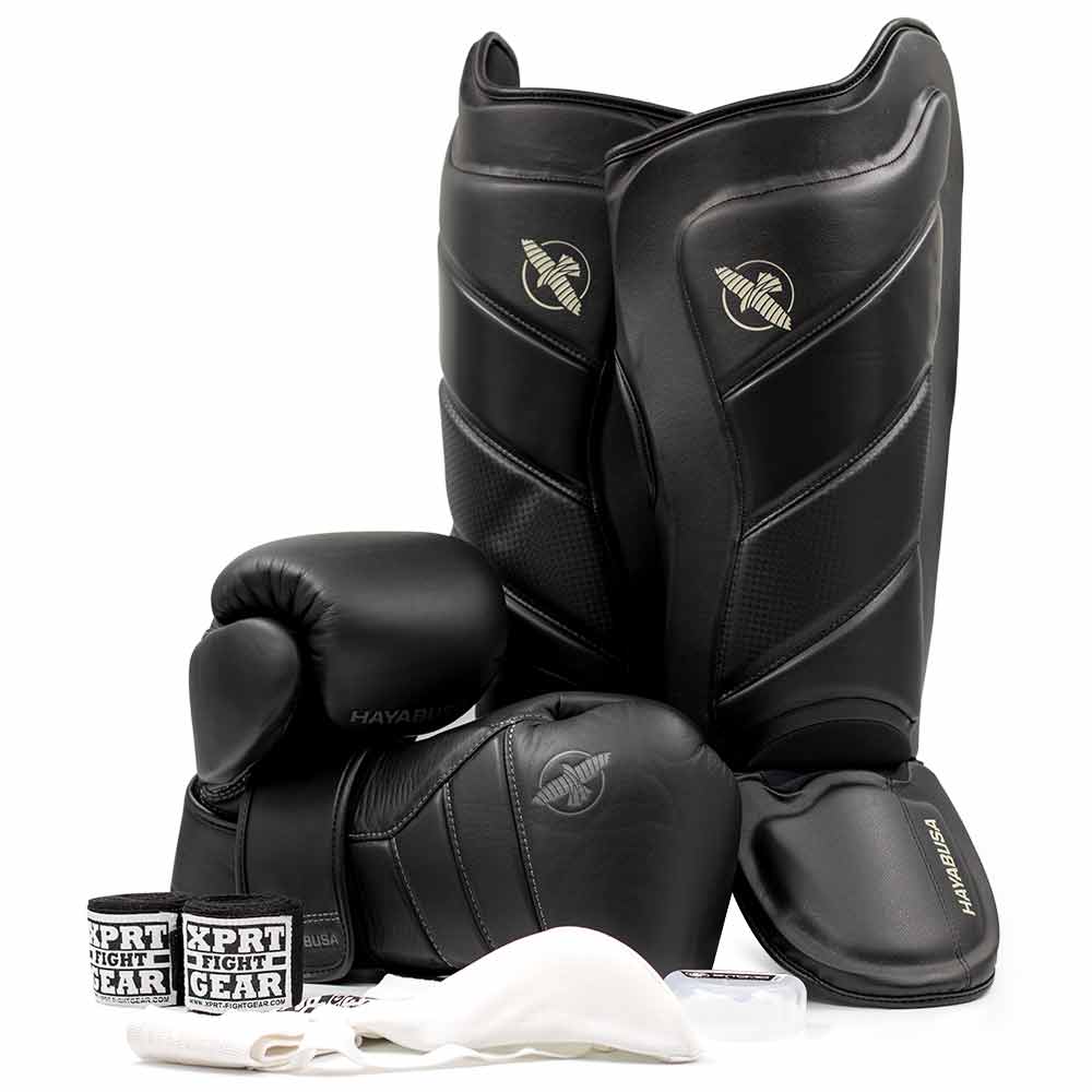 The Hayabusa bundle contains top-quality martial arts equipment, including the T3 Kanpeki boxing gloves, Hayabusa T3 shin guards, handwraps, groin guard, and a mouthguard.