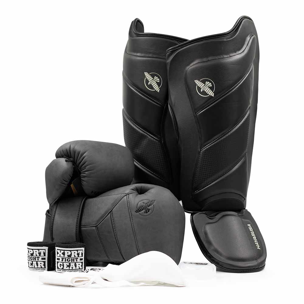 The Hayabusa bundle contains top-quality martial arts equipment, including the T3 LX Obsidian boxing gloves, Hayabusa T3 shin guards, handwraps, groin guard, and a mouthguard.