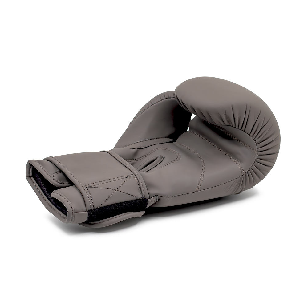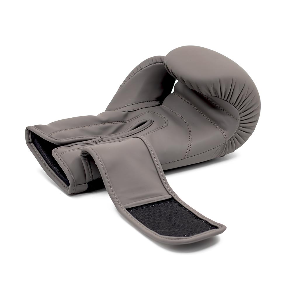 The children's boxing gloves have a very nice and timeless, sleek design in classic grey, with a large brand print in the same grey color diagonally across the striking surface.