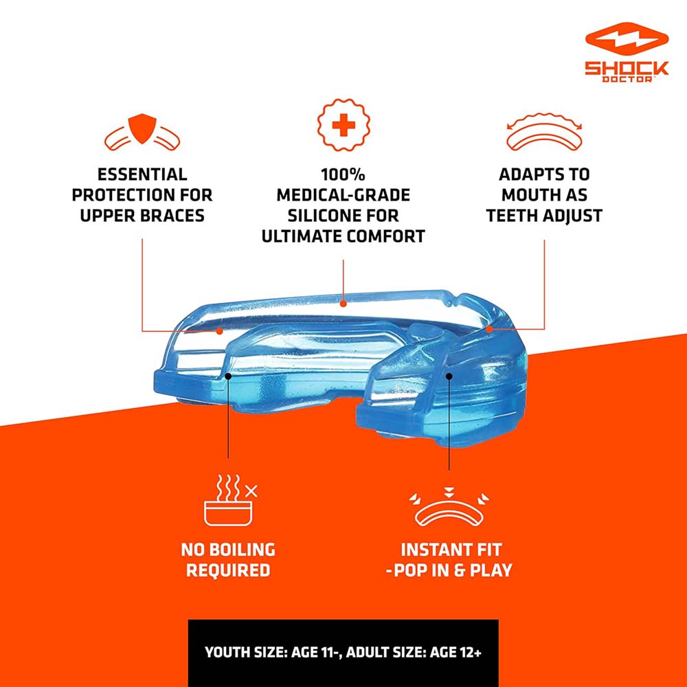Shock Doctor combines technology and design to ensure optimal performance. Shock Doctor products are suitable for both professional and recreational athletes. Unlike most mouthguards, the mouthguard for braces is ready to use immediately .