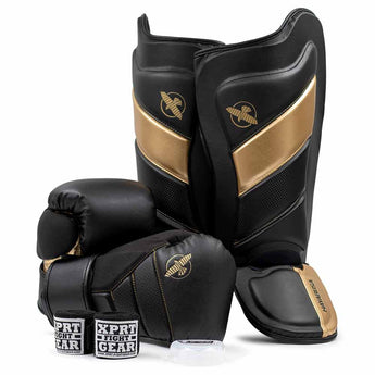 Of course, the Hayabusa kickboxing set also includes matching Hayabusa shin guards. To make the kickboxing set even more attractive, the shin guards are finished in the exact same black and gold color scheme as the boxing gloves.