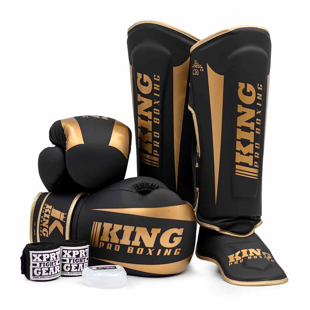 The King Revo Gold Women's Kickboxing Set has everything you need to start kickboxing or Muay Thai right away: boxing gloves, shin guards, a set of handwraps, and a simple mouthguard.