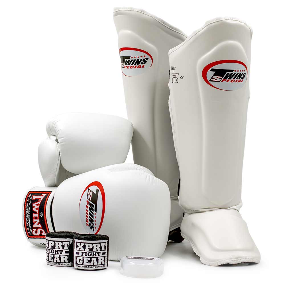 The Twins kickboxing set includes the Twins BGVL3 boxing gloves in all-white. These are the standard in boxing gloves. Made of 100% top-quality leather, these gloves excel in fit and comfort!