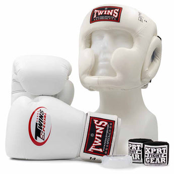 De Boks set Twins Special Wit bevat de allerbeste bokshandschoenen en hoofdbeschermer van het bekende vechtsportmerk Twins. De complete set voor klassiek boksen kenmerkt zich door de super goede pasvorm, hoge duurzaamheid, super kwaliteit materiaal en handgemaakte kwaliteit uit Thailand.