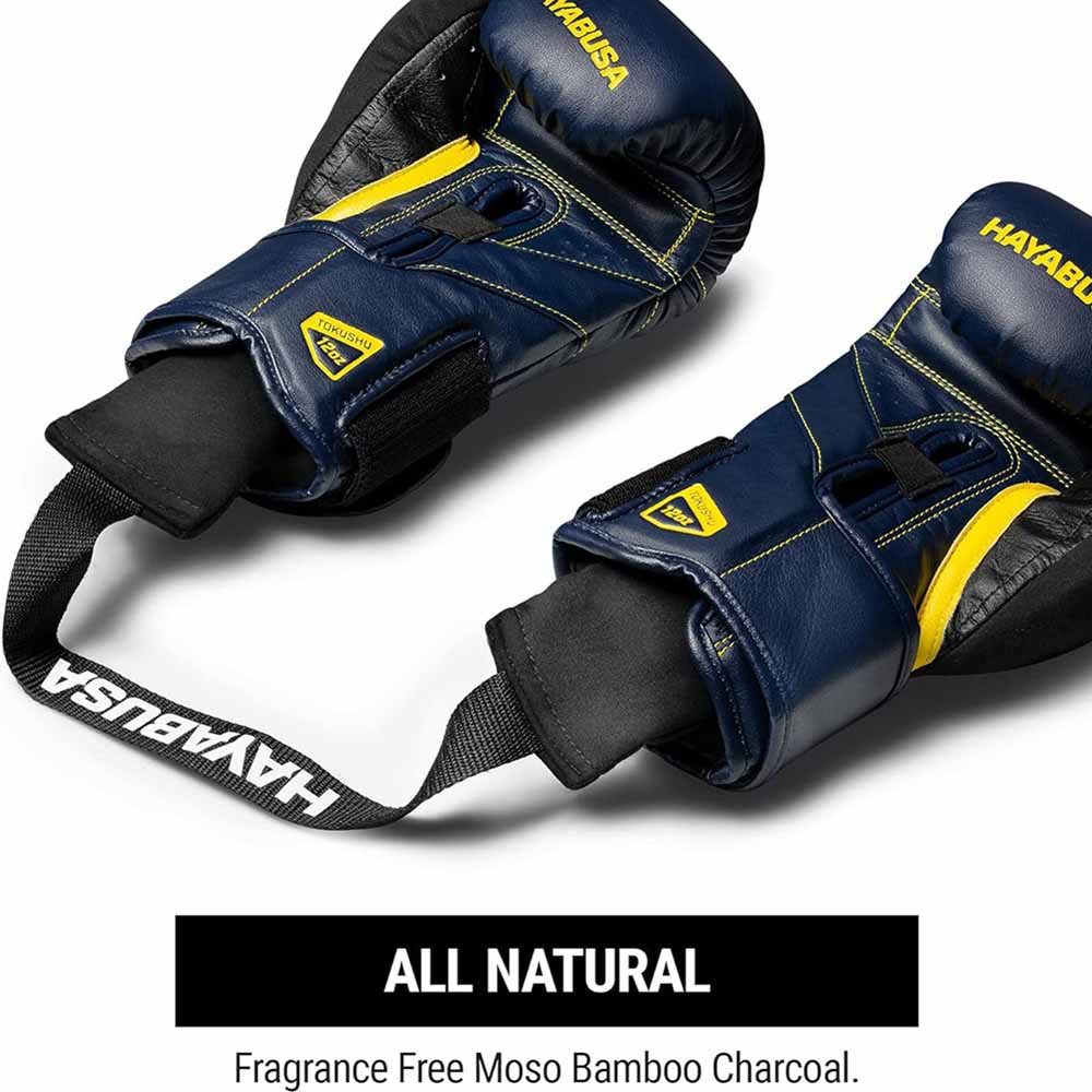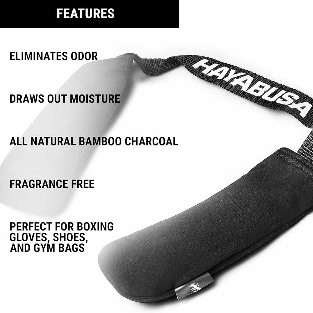 De Deodorizer bokshandschoenen Hayabusa bestaat uit twee elementen welke je in de binnenkant van je, na een training in je bokshandschoenen kunt stoppen. Deze elementen, gevuld met volgroeide moso bamboe houtskool, hebben de eigenschap om vocht uit de bokshandschoenen te onttrekken.