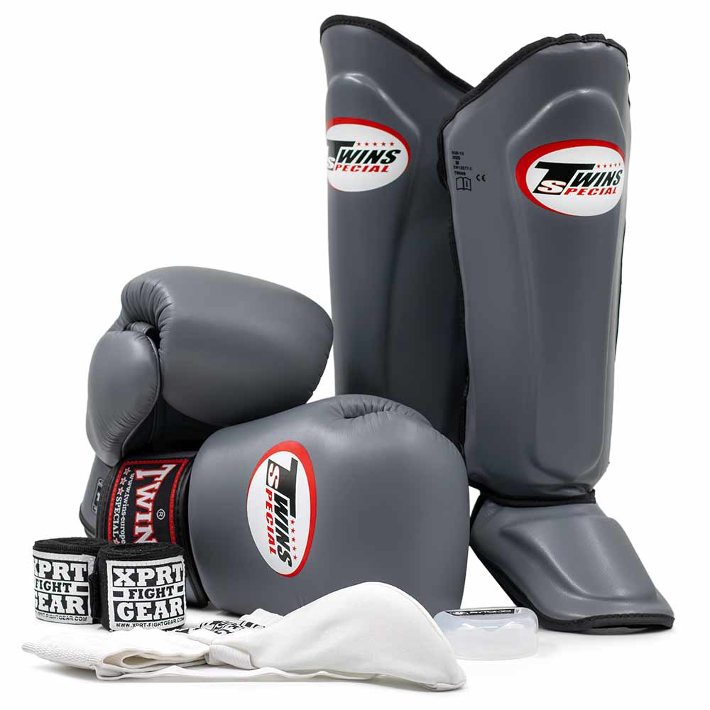 Ontvang de ultieme kickboksuitrusting met deze bundel, inclusief de Twins BGVL3 Metal Grey bokshandschoenen, SGL7 Modern Grey scheenbeschermers, XPRT Easy Stretch zwarte bandages, Bytomic Basic bitje, XPRT Basic heren kruisbeschermer.