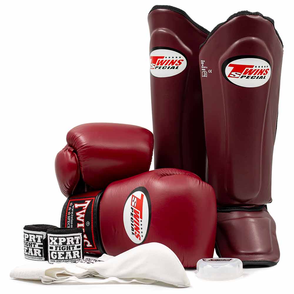 Een bundel met topkwaliteit trainingsuitrusting van Twins! De Wine Red bokshandschoenen blinken uit in pasvorm en comfort, met stevige vulling en duimbescherming. Combineer dit met de scheenbeschermers voor optimale bescherming.