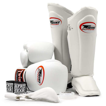 De Kickboks Set Twins Special Wit bevat de allerbeste bokshandschoenen en scheenbeschermers van het bekende vechtsportmerk Twins. Deze complete set voor kickboksen en thaiboksen kenmerkt zich door de super goede pasvorm, hoge duurzaamheid, super kwaliteit materiaal en handgemaakte kwaliteit uit Thailand.