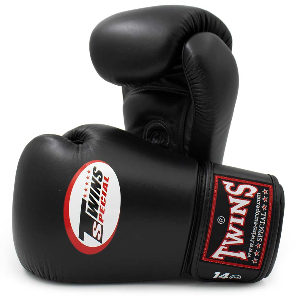 De zwarte Twins kickboks set bevat de populaire bokshandschoenen Twins BGN (met extra padding op de handpalmen). Dit zijn dé standaard op het gebied van bokshandschoenen. Gemaakt van 100% topkwaliteit leer in Thailand. Daarmee blinken deze bokshandschoenen uit in pasvorm en comfort!