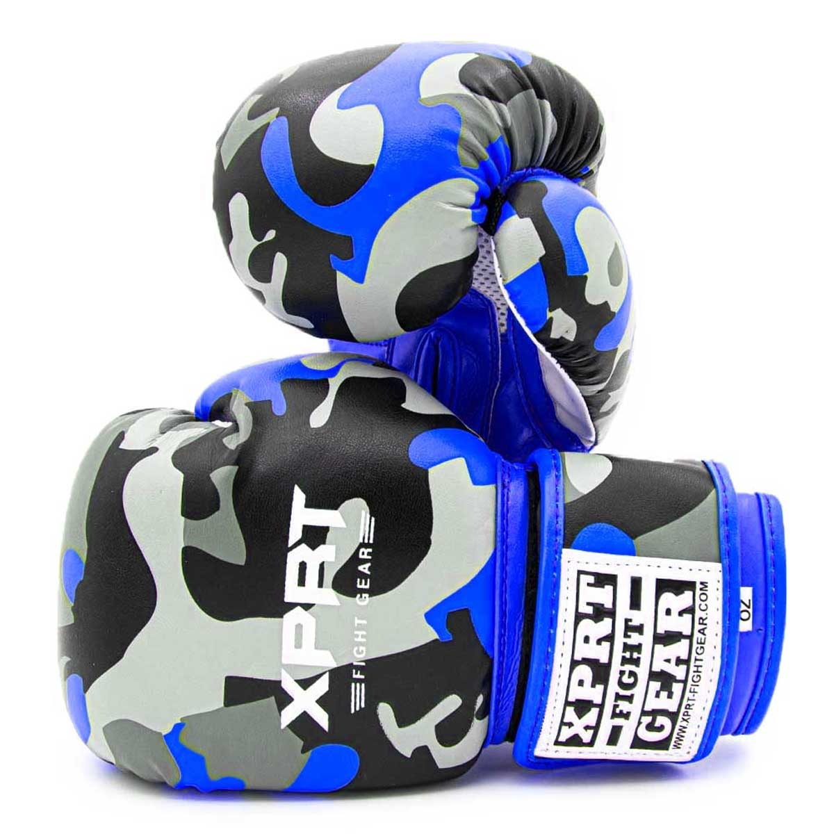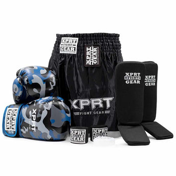 De Kinder kickboks set XPRT Camo Blauw bevat supergave bokshandschoenen en stoere scheenbeschermers die er perfect bij passen. Deze blauwe camouflage set is van het bekende vechtsportmerk XPRT Fight Gear en is prima geschikt voor jongens en meiden van circa 5 t/m 12 jaar.