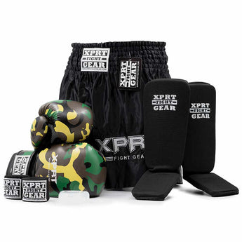 De Kinder kickboks set XPRT Camo Groen bevat supergave bokshandschoenen en stoere scheenbeschermers die er perfect bij passen. Deze groene camouflage set is van het bekende vechtsportmerk XPRT Fight Gear en is prima geschikt voor jongens en meiden van circa 5 t/m 12 jaar.