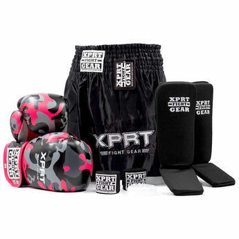 De Kinder kickboks set XPRT Camo Roze bevat supergave bokshandschoenen en stoere scheenbeschermers die er perfect bij passen. Deze roze camouflage set is van het bekende vechtsportmerk XPRT Fight Gear en is prima geschikt voor meiden van circa 5 t/m 12 jaar.