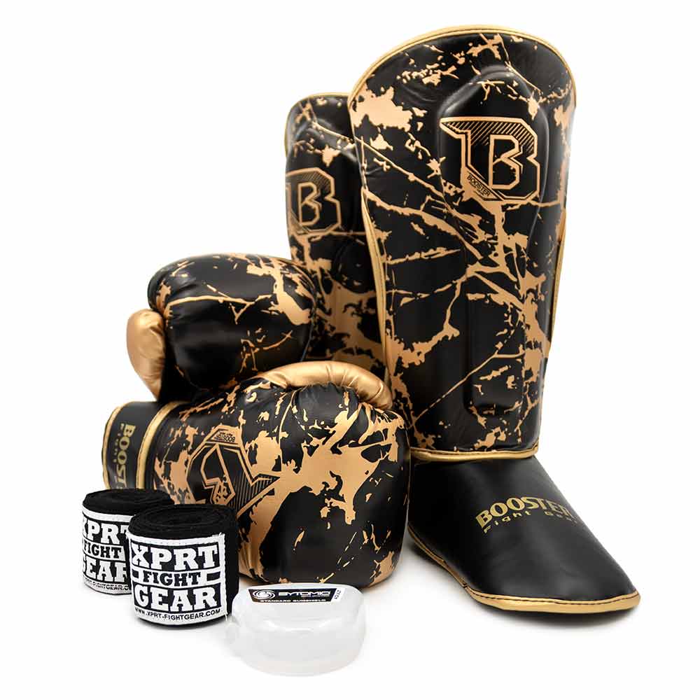De Kinder kickboks set Booster Marble Gold bevat supergave bokshandschoenen en scheenbeschermers in exact dezelfde kleurencombinatie. Deze set voor kinderen is van het bekende vechtsportmerk Booster en is prima geschikt voor jongens en meisjes van 5 t/m 12 jaar.